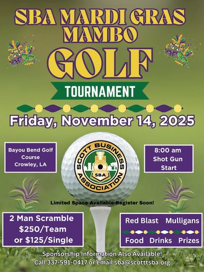 To help with the cost of the Scott Mardi Gras Parade, SBA will hold their 2nd annual golf tournament on Friday, November 14, 2025, at Bayou Bend Golf Course in Crowley, La.